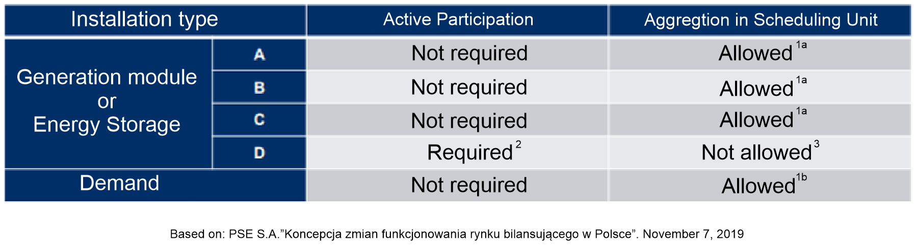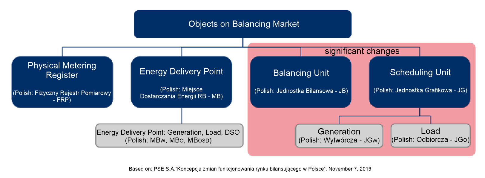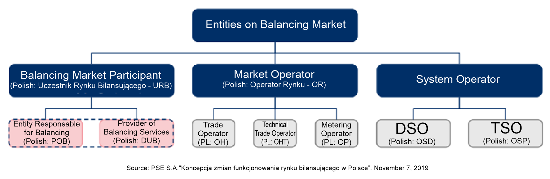 Balancing Market Participant is allowed to be both Entity Responsable for Balancing and Provider of Balancing Services, but in all cases has to meet the legal and technical requirements of the participation in Balancing Market. The owner of the instalations connected to the transmission network does not have to be Balancing Market Participant. Distinction of generators, consumers, trade has been abandoned for Balancing Market Participants however distinction for TSO (Polish: Operator Systemu Przesyłowego Elektroenergetycznego - URBBIL), DSO (Polish: Operator Systemu Dystrybucyjnego Elektroenergetycznego - URBOSD), Energy Exchanges (Polish: Giełdy Energii - URBGE) is to be conserved.